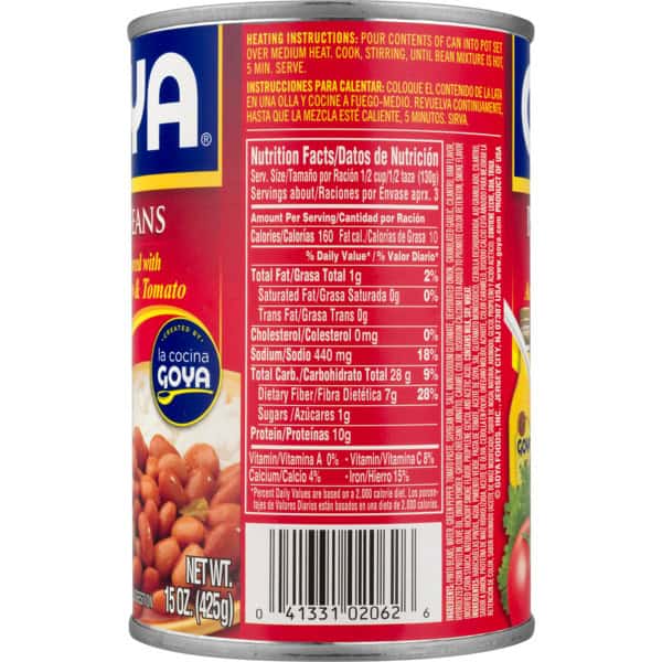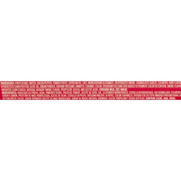 Pinto Beans, Water, Green Bell Pepper, Tomato Paste, Salt, Monosodium Glutamate, Soybean Oil, Dehydrated Onion, Granulated Garlic, Natural & Artificial Ham Type Flavor (maltodextrin, Salt, Palm Oil, Yeast Extract, Molasses, Silicon Dioxide, Garlic Powder, Onion Powder, Medium Chain Triglycerides, Sunflower Oil, Natural & Artificial Flavors, Natural Smoke Flavor And Citric Acid), Culantro, Hydrolyzed Corn Protein, Olive Oil, Onion Powder, Ground Oregano, Disodium Edta Added To Promote Color Retention, Caramel Color, Natural Hickory Smoke Flavor (maltodextrin, Natural Hickory Smoke Flavor, Silicon Dioxide As Anticaking Agent) And Annatto.