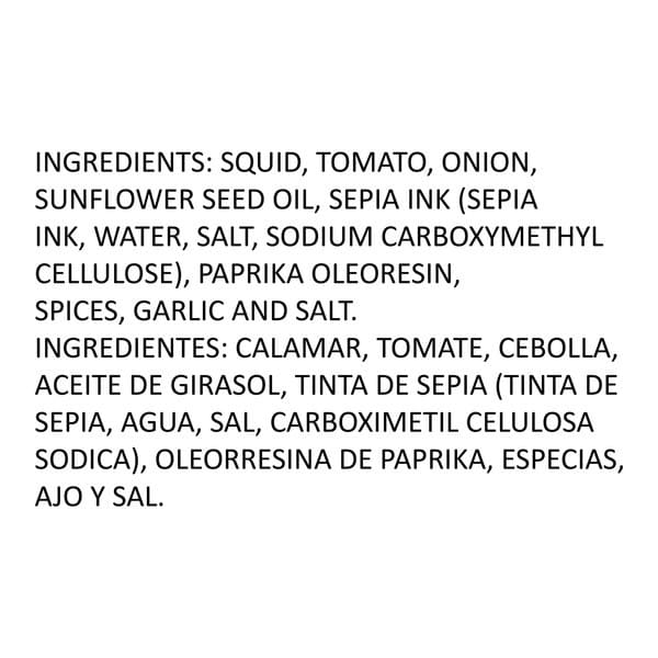 IngredientsSquid, Sunflower Seed Oil, Tomato, Onion, Sepia Ink (sepia Ink, Water, Salt, Sodium Carboxymethyl Cellulose), Paprika Oleoresin, Garlic, Spices, Salt