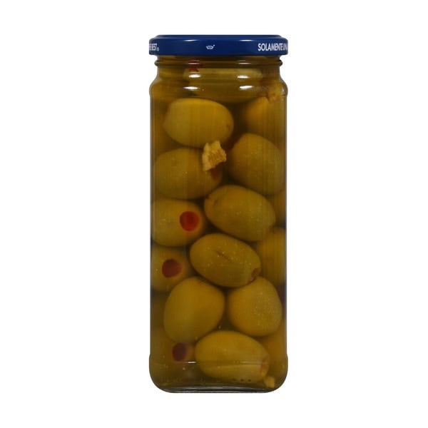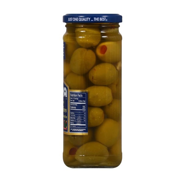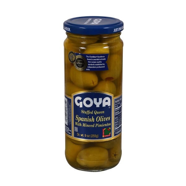 Queen Olives, Water, Pureed Pimiento, Salt, Lactic Acid, Sodium Alginate And Guar Gum.