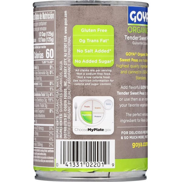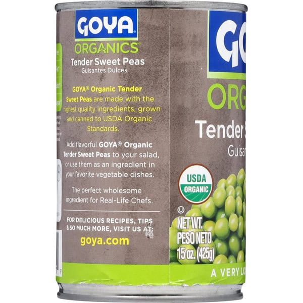 Fruits. Grains. Vegetables. Protein. Dairy. Choosemyplate.gov. Goya Organic Tender Sweet Peas are made with the highest quality ingredients, grown and canned to USDA Organic standards. Add flavorful Goya Organic tender sweet peas to your salad, or use them as an ingredient in your favorite vegetable dishes. The perfect wholesome ingredient for real-life chefs.