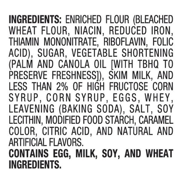 Enriched Flour (bleached Wheat Flour, Niacin, Reduced Iron, Thiamin Mononitrate, Riboflavin, Folic Acid), Sugar, Vegetable Shortening (palm And Canola Oil, [with Tbhq To Preserve Freshness]), Skim Milk, And Less Than 2% Of The Following: High Fructose Corn Syrup, Corn Syrup, Eggs, Whey, Leavening (baking Soda), Salt, Soy Lecithin, Modified Corn Starch, Caramel Color, Citric Acid, And Natural And