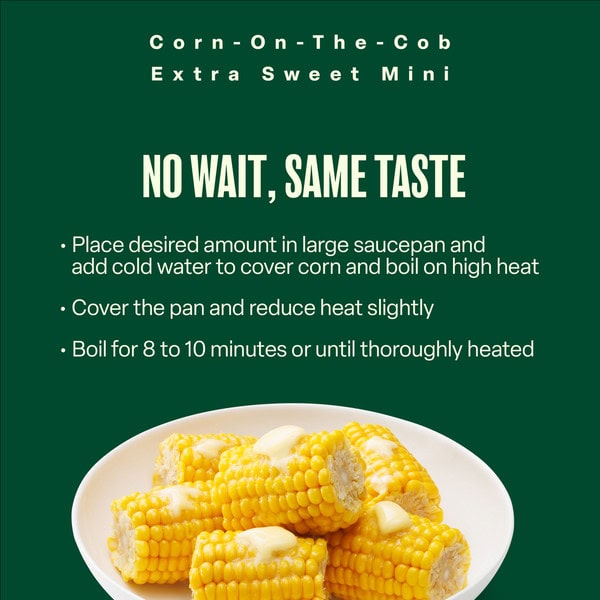 Green Giant Extra Sweet Corn on the Cob Mini Ears are just the right size to nibble with your favorite meal. Picked at the peak of perfection for delicious flavor, these frozen Green Giant Nibblers let you enjoy a classic side dish all year long. Made without seasonings, these mini ears are tasty on their own or dressed with butter and salt. Serve these extra sweet corn Nibblers at a backyard barbecue or use them to spice up a simple weeknight meal. Keep these frozen mini ears in the freezer for freshness, and cook in the microwave or on the stovetop for best results. Green Giant works hard to make it easy for you to be good to yourself.