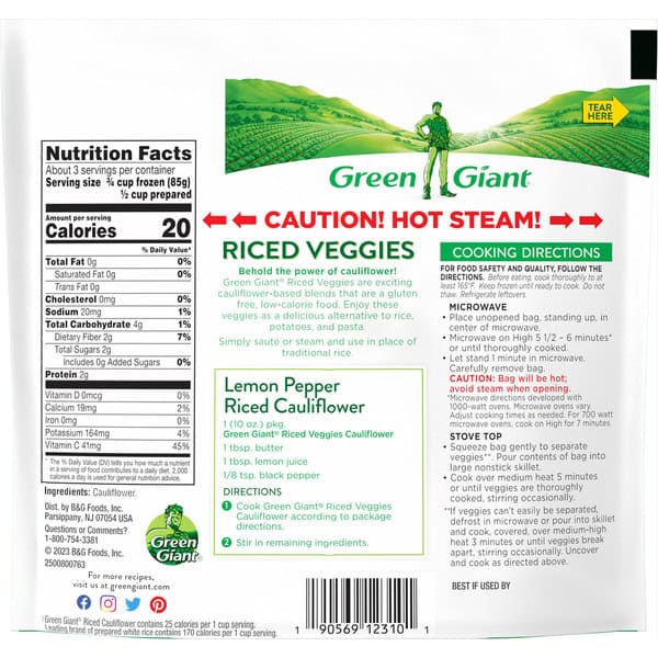 Green Giant Riced Veggies Cauliflower has the feel of one of your favorite side dishes but with a frozen veggie, cauliflower twist. Made with 100% vegetables, these riced vegetables are a delicious dinnertime side dish and a unique alternative to white rice. These Green Giant frozen vegetables come without sauce or seasoning so you can prepare them how you want or pair them with a variety of entrees. These frozen rice veggies have 4 grams of carbs per serving and are gluten-free. Serve these riced veggies as an alternative to rice, potatoes, and pasta at any lunch or dinner. To prepare this riced cauliflower, simply follow the cooking instructions and heat in the microwave or on the stovetop. Keep Green Giant frozen riced cauliflower in the freezer until you are ready to prepare and serve.