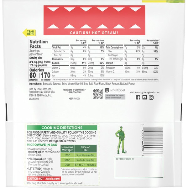 Green Giant Simply Steam Seasoned Brussels Sprouts deliver the great-tasting steamed vegetables you and your family want to live a balanced lifestyle. A flavorful addition to lunch or dinner, each bag contains brussels sprouts seasoned with sea salt, cracked pepper, and extra virgin olive oil. Made with no artificial flavors or preservatives, Green Giant frozen vegetables make it easier to get your daily serving of veggies. These frozen brussels sprouts provide 60 calories per serving, and are available in a convenient microwave-safe bag for easy preparation. To enjoy these brussels sprouts, microwave in the bag on high for 5 to 7 and a half minutes depending on your microwave wattage until thoroughly cooked, and let them sit for one minute before serving. Keep Green Giant Simply Steam Seasoned Brussels Sprouts frozen until you are ready to cook and refrigerate any leftovers. Green Giant works hard to make it easy for you to be good to yourself.