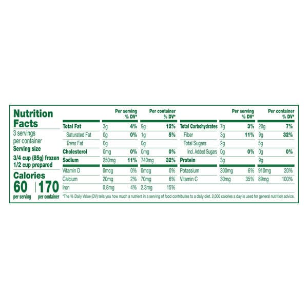 • Serving size 3/4 cup (85 g) frozen 1/2 cup prepared
