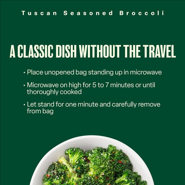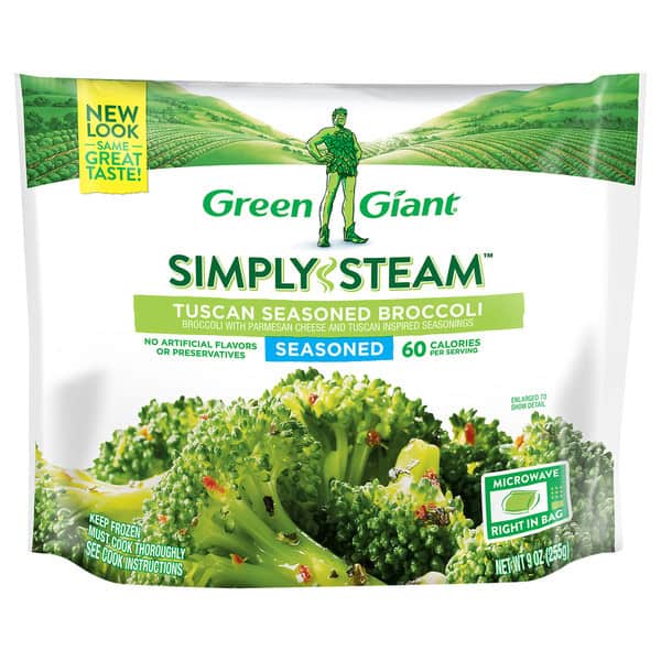 • One 9 ounce bag of Green Giant Simply Steam Tuscan Seasoned Broccoli, Seasoned Frozen Vegetables
