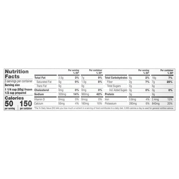 • Flavorful steamed broccoli contains 50 calories per serving, and is made with no artificial flavors or preservatives