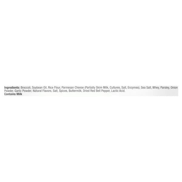 Broccoli, Soybean Oil, Rice Flour, Parmesan Cheese (partially Skim Milk, Cultures, Salt, Enzymes), Sea Salt, Whey, Parsley, Onion Powder, Garlic Powder, Natural Flavors, Salt, Spices, Buttermilk, Dried Red Bell Pepper, Lactic Acid