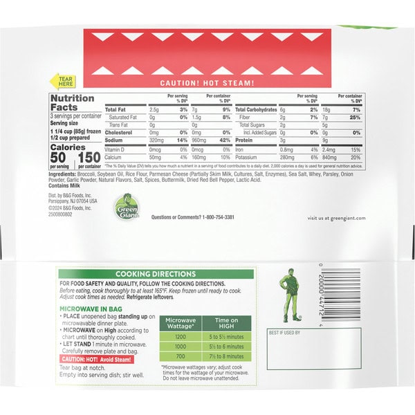 Green Giant Simply Steam Tuscan Seasoned Broccoli delivers the great-tasting steamed vegetables you and your family want to live a balanced lifestyle. A flavorful addition to lunch or dinner, each bag contains steamed broccoli with parmesan cheese and Tuscan-inspired seasoning. Made with no artificial flavors or preservatives, Green Giant frozen vegetables make it easier to get your daily serving of veggies. This frozen broccoli provides 50 calories per serving, and is available in a convenient microwave-safe bag for easy preparation. To enjoy this Tuscan broccoli, microwave it in the bag on high for 5 to 8 minutes depending on your microwave wattage, and let it stand for 1 minute before serving. Keep Green Giant Simply Steam Tuscan Seasoned Broccoli frozen until you are ready to cook and refrigerate any leftovers. Green Giant works hard to make it easy for you to be good to yourself.