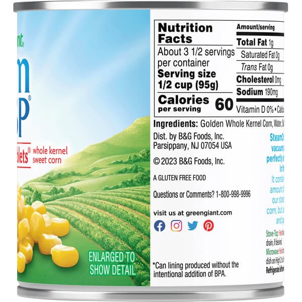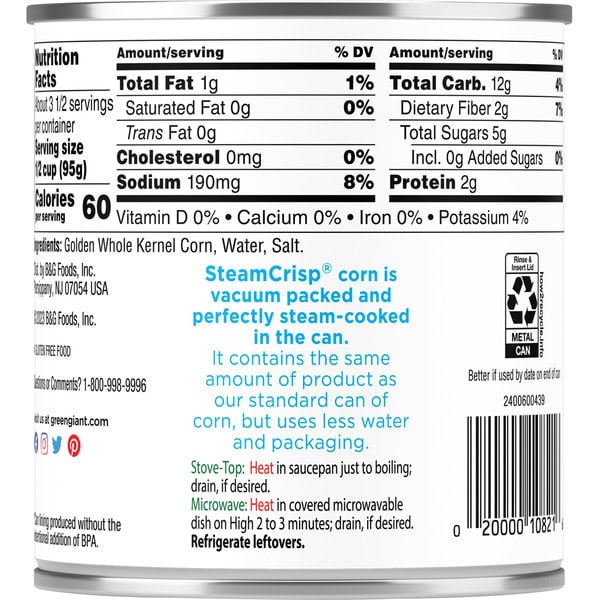 SteamCrisp® corn is vacuum packed and perfectly steam-cooked in the can. It contains the same amount of product as our standard can of corn, but uses less water and packaging.