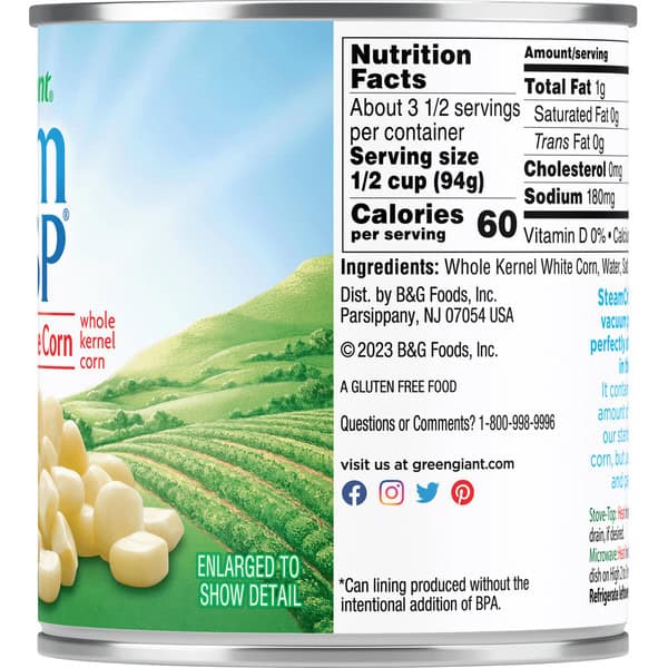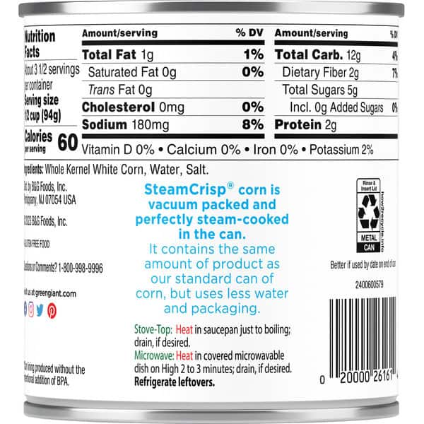 SteamCrisp® corn is vacuum packed and perfectly steam-cooked in the can. It contains the same amount of product as our standard can of corn, but uses less water and packaging.
