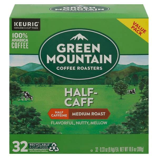 The mountains are a special place. It’s where Green Mountain Coffee Roasters was born. It’s where we developed our adventurous spirit and commitment to improving the lands through sustainably sourced coffee. We’re driven to bring the world a richer, better cup of coffee. Be bold. Be alive. Grab a cup and get out there. The Green Mountain Coffee Roasters Half-Caff is a flavorful and mellow blend that is the best of both worlds: all the flavor and half the caffeine. Notes of chocolate and raisin lead to a smooth, nutty finish. Made with 100% Arabica coffee. These single-serve K-Cup pods are compatible with all Keurig K-Cup Pod Single-Serve Coffee Makers. Each K-Cup pod is filled with the freshest ground coffee and brews a perfect, great tasting cup of coffee, every time. Certified Orthodox Union Kosher. What does being 100% responsibly sourced coffee mean? Responsibly Sourced means the coffee we purchase is grown and sold in adherence to a credible sourcing program that aligns with our company Responsible Sourcing Guidelines. Our coffee is 100% responsibly sourced. Introducing Recyclable* K-Cup Pods: Simple. Delicious. And now Recyclable. Enjoy the same great-tasting coffee you know and love, and when you’re done just peel, empty and recycle. *Check locally, not recycled in all communities. Packaging may vary.