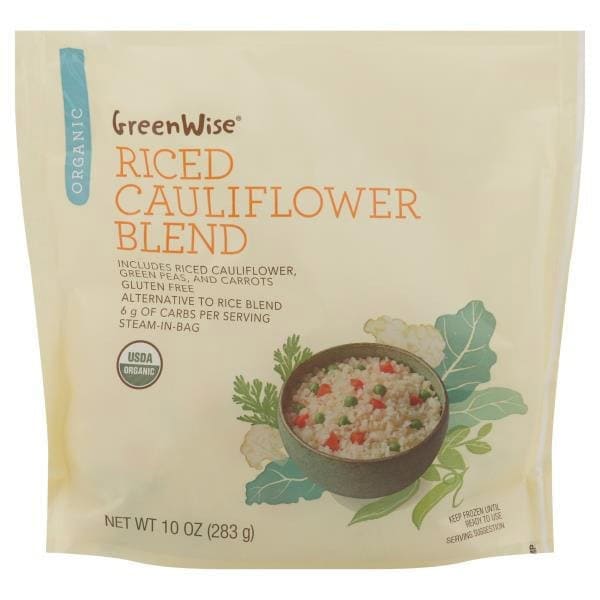 Cooking Instructions: Microwave: Microwave ovens vary. Adjust times as needed to reach 165 degrees F. Measure temperature in several spots using a food thermometer do not thaw; cook from frozen. Cook thoroughly to a temperature of 165 degrees F. Instructions are for one bag at a time. Leftovers should be refrigerated immediately. Reheat via stovetop instructions prior to consumption. 1. Place frozen, unopened bag this side up in microwave. Do not pierce bag. 2. Microwave on high for recommended cook time based on your microwave wattage. During cooking, the bag will slowly inflate. A vent in the bag will allow steam to escape; a slight whistling may be heard. 3. Let stand 1-2 minutes in microwave for hot steam to escape. Carefully handle bag at corners and remove from microwave. Tear bag open at notch; pour product into serving dish. Stir and serve. Microwave cook time for Riced Cauliflower Blend: Wattage: 1200; 5:30 minutes. Wattage: 1000; 6 minutes. Wattage 800; 7 minutes. Caution! Product will be hot! Stovetop: 1. Empty frozen contents of bag into a 2-quart saucepan; add 1/4 cup of water. 2. Cover pan with lid and cook over medium for 11-12 minutes, stirring occasionally, until heated through. 3. Remove pan from heat and set aside 1-2 minutes. Drain and serve.