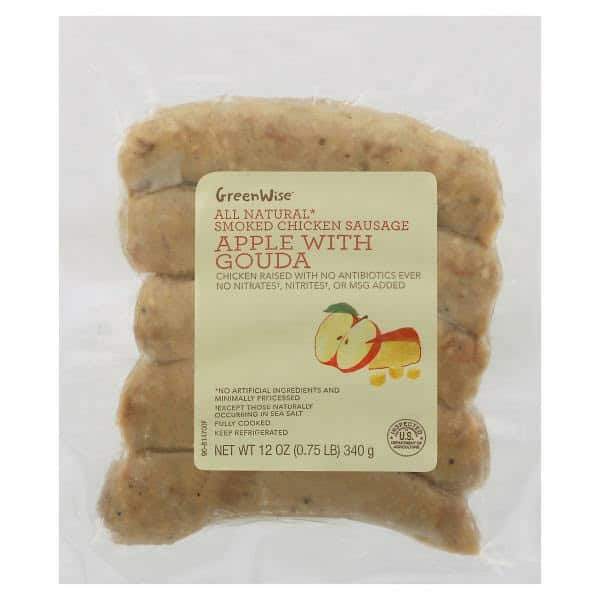 Chicken, Gouda Cheese (Pasteurized Milk, Cheese Cultures, Salt, Enzymes, Annatto [Color]), Dehydrated Apple, Apple Juice, Less than 2% of Vinegar, Brown Sugar, Sugar, Sea Salt, Spices, in a Natural Pork Casing.