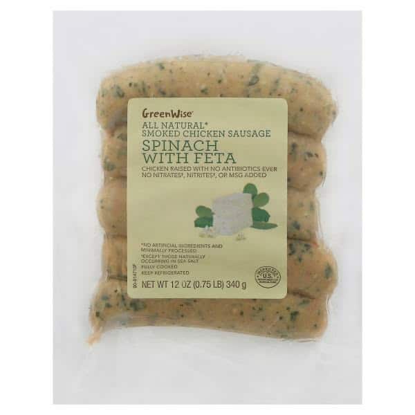 Chicken, Spinach, Feta Cheese (Pasteurized Milk, Salt, Cheese Cultures, Enzymes), Seasoning (Salt, Sugar, Dehydrated Garlic, Spices, Spice Extractive), Vinegar, in Natural Pork Casing.