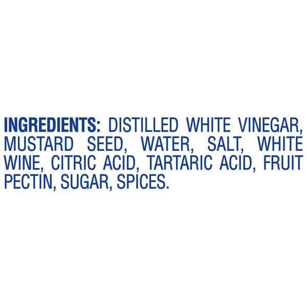 Distilled White Vinegar, Mustard Seed, Water, Salt, White Wine, Citric Acid, Tartaric Acid, Fruit Pectin, Sugar, Spices