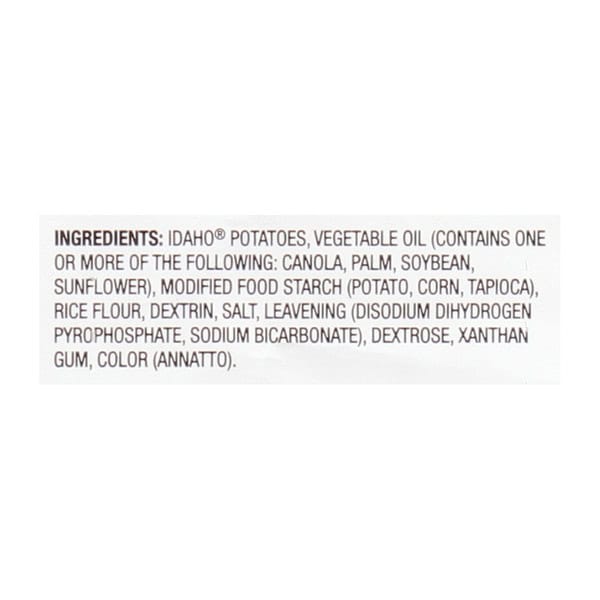 Idaho® Potatoes, Vegetable Oil (contains One Of More Of The Following: Canola, Palm, Soybean, Sunflower), Modified Food Starch (potato, Corn, Tapioca), Rice Flour, Dextrin, Salt, Leavening (disodium Dihydrogen Pyrophosphate, Sodium Bicarbonate), Dextrose, Xanthan Gum, Color (annatto)