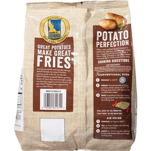 Bake: Cooking Directions: Conventional Oven: 1. Preheat to 425 degrees F. 2. Spread desired quantity of frozen potatoes evenly across an 11 inches x 17 inches baking sheet lined with aluminum foil or parchment paper. 3. Bake according to the chart below; turning potatoes over halfway through the baking time. Full bag 24 – 26 minutes. Half bag 18 – 20 minutes. Air Fryer: 1. Preheat air fryer to 360 degrees F. 2. Fill air fryer basket with half bag of frozen potatoes. 3. Cook for 10- 12 minutes; slide out basket and shake halfway through cooking time. For food safety product must be cooked thoroughly before eating. Keep frozen. Do not thaw read and follow cooking instructions as product must reach a minimum of 165 degrees F (74 degrees C) internal temperature as measured by a food thermometer in several spots appliances vary. Adjust cooking times as needed.