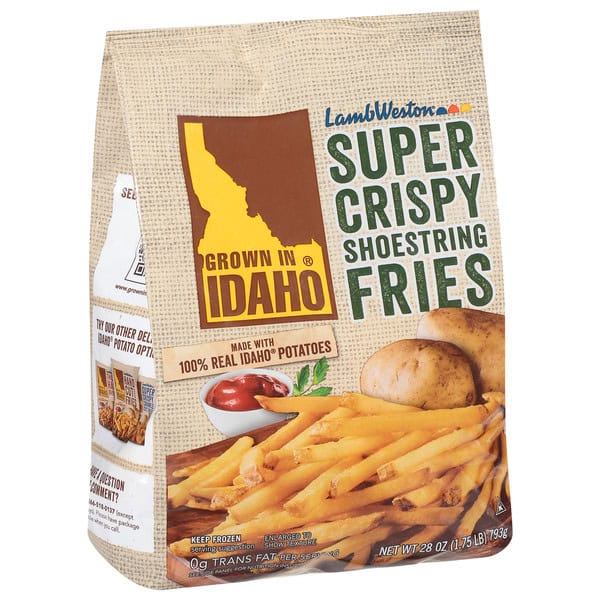 Grown In Idaho® Super Crispy Shoestring Fries are crispy on the outside with hot, fluffy, soft-baked texture inside. We’ve used 100% certified Idaho® Potatoes to make these delicious, super crispy, thin-cut shoestring fries, loaded with real potato flavor. They’re not just crispy, they’re super crispy! Our potatoes are par-fried before freezing, which means they are already partially prepared and only need to be cooked before eating. Simply heat oven to 425°F and bake 18-20 minutes for half a bag and 24-26 minutes for a full bag. Or air fry at 360°F for 10-12 minutes. Each order includes one 28 oz. bag of Grown In Idaho Super Crispy Shoestring Fries.