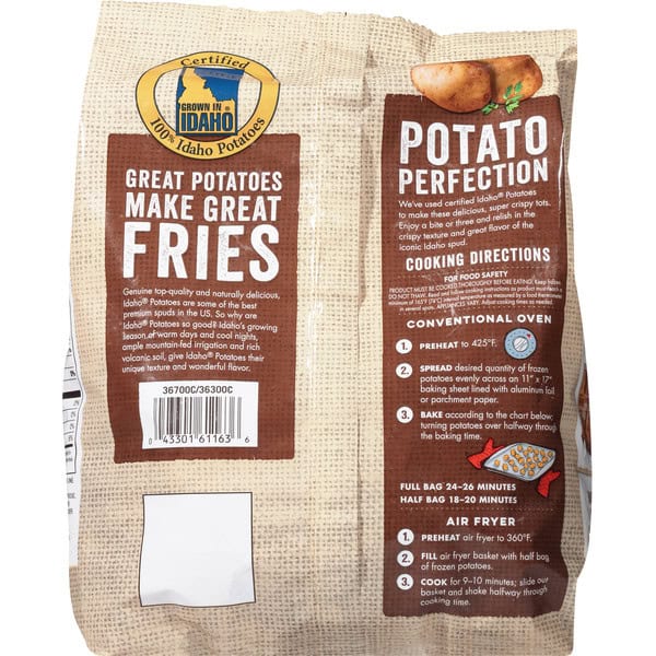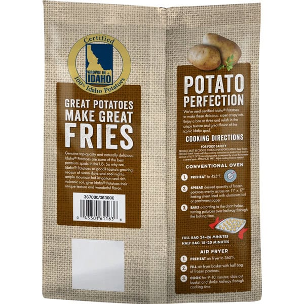 Cooking Directions: Conventional Oven: 1. Preheat to 425 degrees F. 2. Spread desired quantity of frozen potatoes evenly across an 11 inches x 17 inches baking sheet lined with aluminum foil or parchment paper. 3. Bake according to the chart below; turning potatoes over halfway through the baking time. Full bag 24 – 26 minutes. Half bag 18 – 20 minutes. Air Fryer: 1. Preheat air fryer to 360 degrees F. 2. Fill air fryer basket with half bag of frozen potatoes. 3. Cook for 9 – 10 minutes; slide out basket and shake halfway through cooking time. For food safety product must be cooked thoroughly before eating. Keep frozen. Do not thaw read and follow cooking instructions as product must reach a minimum of 165 degrees F (74 degrees C) internal temperature as measured by a food thermometer in several spots appliances vary. Adjust cooking times as needed.