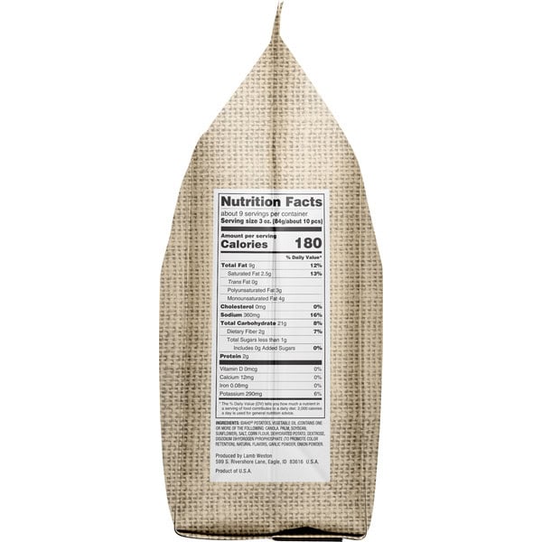 Idaho Potatoes, Vegetable Oil (contains One Or More Of The Following: Canola, Palm, Soybean, Sunflower), Salt, Corn Flour, Dehydrated Potato, Dextrose, Disodium Dihydrogen Pyrophosphate (to Promote Color Retention), Natural Flavors, Garlic Powder, Onion Powder.