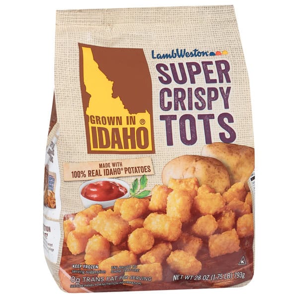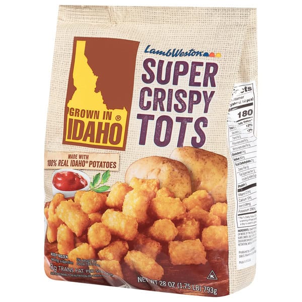 Grown In Idaho® Super Crispy Tots are crispy on the outside with hot, fluffy, soft-baked texture inside. We’ve used 100% certified Idaho® Potatoes to make these delicious, crispy tots, loaded with real potato flavor. Our potatoes are par-fried before freezing, which means they are already partially prepared and only need to be cooked before eating. Simply heat oven to 425°F and bake 18-20 minutes for a half baking sheet and 24-26 minutes for a full baking sheet, stirring halfway through cooking time. Each order includes one 28 oz. bag of Grown In Idaho Super Crispy Tots.