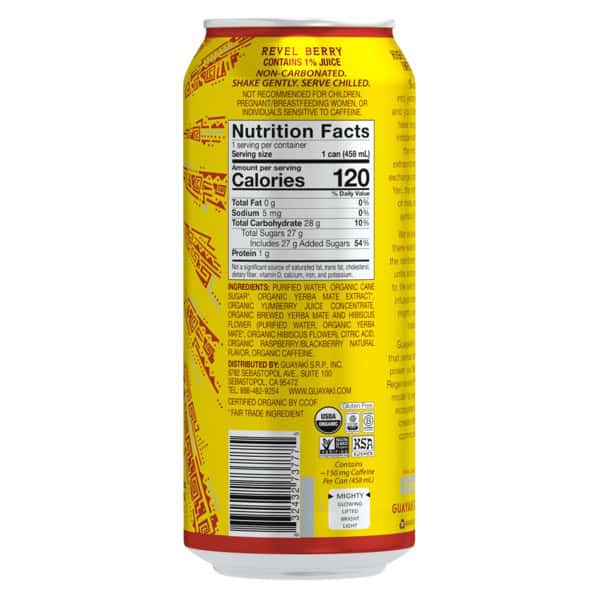 Purified water, organic cane sugar*, organic yerba mate extract*, organic yumberry juice concentrate, organic brewed yerba mate and hibiscus flower (purified water, organic yerba mate*, organic hibiscus flower), citric acid, organic raspberry/blackberry natural flavor, organic caffeine. *Fair trade ingredient