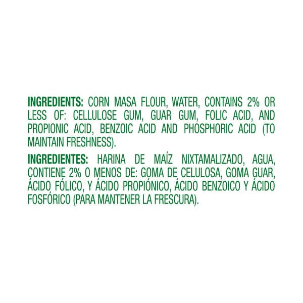 Corn Masa Flour, Water, Contains 2% Or Less Of: Cellulose Gum, Guar Gum, And Propionic Acid, Benzoic Acid And Phosphoric Acid (to Maintain Freshness)