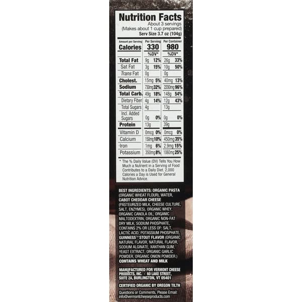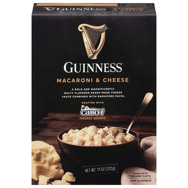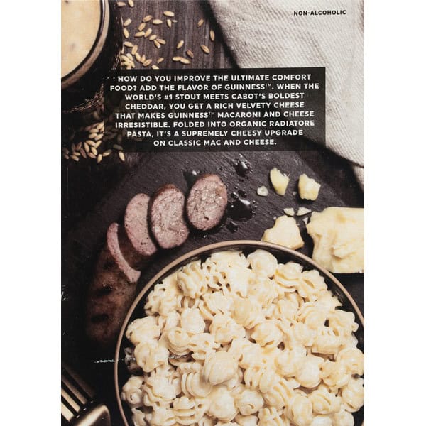 Organic Pasta (organic Wheat Flour), Water, Cabot Cheddar Cheese (pasteurized Milk, Cheese Culture, Salt, Enzymes), Organic Whey, Organic Canola Oil, Organic Maltodextrin, Organic Non-fat Dry Milk, Sodium Phosphate, Contains 2% Or Less Of: Salt, Lactic Acid, Potassium Phosphate, Guinnessâ„¢ Stout Flavor (organic Natural Flavor, Natural Flavor, Sodium Alginate, Xanthan Gum, Yeast Extract, Organic Garlic Powder, Organic Onion Powder.)