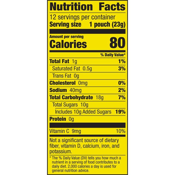 Strawberry Splash Ingredients: Sugar, Corn Syrup, Dried Corn Syrup, Pear Puree Concentrate, Modified Corn Starch, Fructose, Maltodextrin, Palm Oil. Contains 2% Or Less Of: Cottonseed Oil, Glycerin, Grape Juice Concentrate, Carrageenan, Citric Acid, Monoglycerides, Sodium Citrate, Malic Acid, Vitamin C (ascorbic Acid), Natural Flavor, Potassium Citrate, Agar-agar, Red 40, Xanthan Gum, Tropical Flavors Ingredients: Sugar, Corn Syrup, Dried Corn Syrup, Pear Puree Concentrate, Modified Corn Starch, Fructose, Maltodextrin, Palm Oil. Contains 2% Or Less Of: Cottonseed Oil, Glycerin, Grape Juice Concentrate, Carrageenan, Citric Acid, Monoglycerides, Sodium Citrate, Malic Acid, Vitamin C (ascorbic Acid), Natural Flavor, Potassium Citrate, Agar-agar, Xanthan Gum, Color (red 40, Blue 1, Yellow 5 & 6)