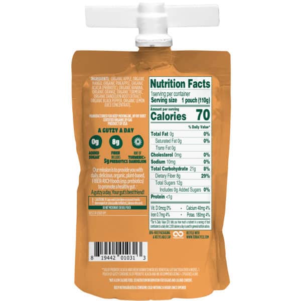 Organic Apple, Organic Mango, Organic Pineapple, Organic Acacia (prebiotic), Organic Banana, Organic Orange, Organic Turmeric, Organic Dandelion Root Extract, Organic Black Pepper, Organic Lemon Juice Concentrate.