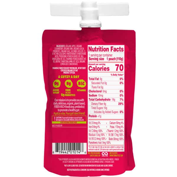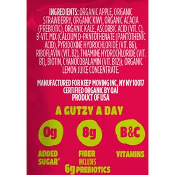 Organic Apple, Organic Strawberry, Organic Kiwi, Organic Acacia (prebiotic), Organic Kale, Ascorbic Acid (vit.c), Calcium-d-pantothenate (pantothenic Acid), Pyridoxine Hci (vit. B6), Riboflavin (vit. B2), Thiamine Hci (vit. B1), Biotin, Cyanocobalamin (vit. B12), Organic Lemon Juice Concentrate