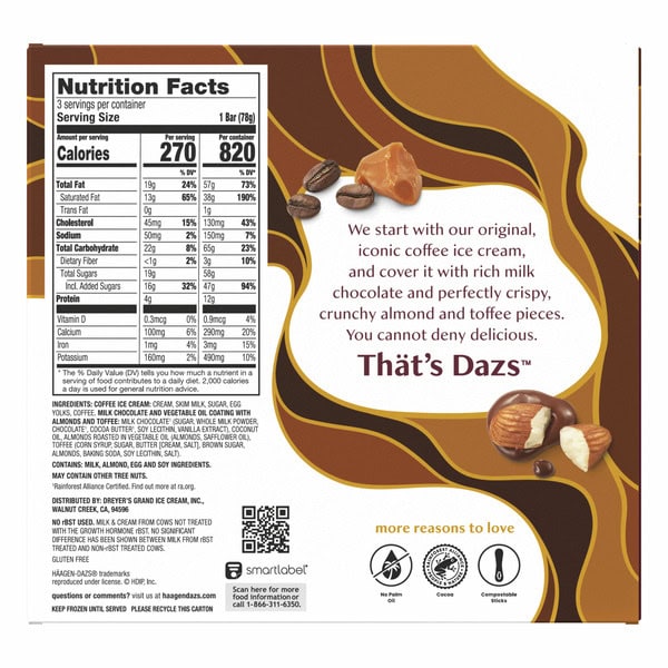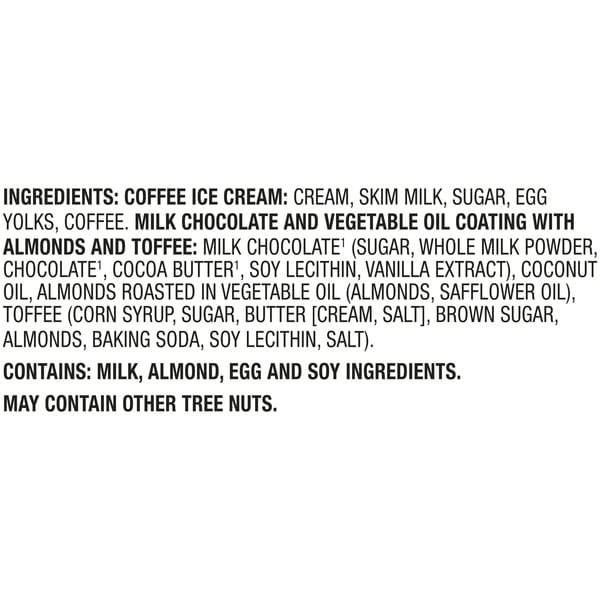 Coffee Ice Cream: Cream, Skim Milk, Sugar, Egg Yolks, Coffee. Milk Chocolate And Vegetable Oil Coating With Almonds And Toffee: Milk Chocolate (sugar, Whole Milk Powder, Chocolate, Cocoa Butter, Soy Lecithin, Vanilla Extract), Coconut Oil, Almonds Roasted In Vegetable Oil (almonds, Safflower Oil), Toffee (corn Syrup, Sugar, Butter [cream, Salt], Brown Sugar, Almonds, Baking Soda, Soy Lecithin, Salt).