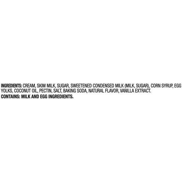 Cream, Skim Milk, Sugar, Sweetened Condensed Milk (condensed Milk, Sugar), Egg Yolks, Corn Syrup, Coconut Oil, Pectin, Soy Lecithin, Salt, Baking Soda, Vanilla Extract.