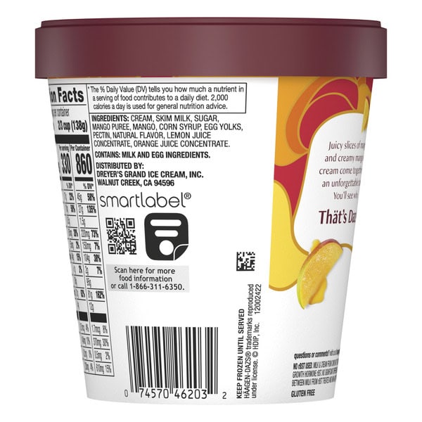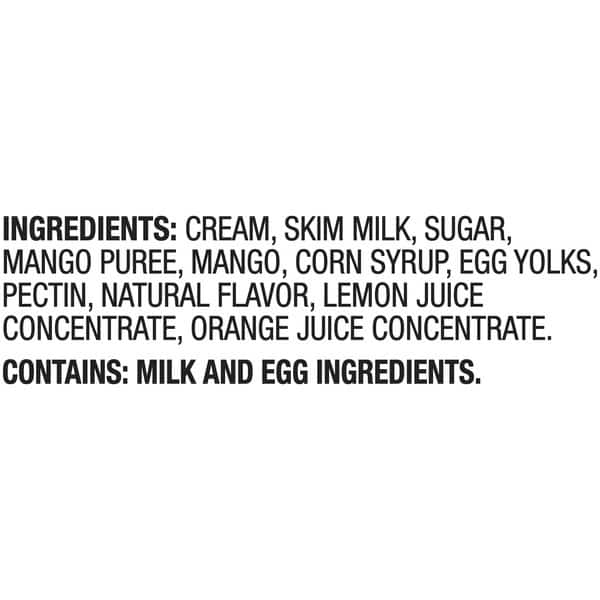 Cream, Skim Milk, Sugar, Mango Puree, Mango, Corn Syrup, Egg Yolks, Pectin, Orange Juice Concentrate, Natural Flavor, Lemon Juice Concentrate.
