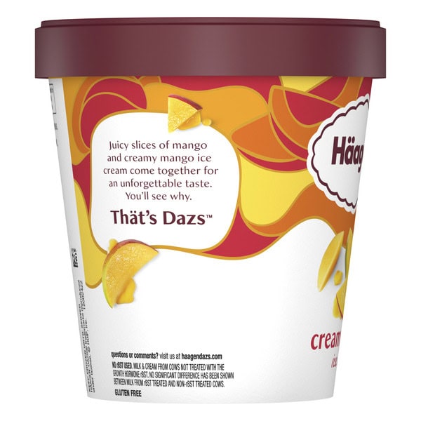 Juicy slices of mango and creamy mango ice cream come together for an unforgettable taste. You’ll see why. In 1960, two Polish immigrants from the Bronx decided to create a new luxury in ice cream. They invented a recipe, dreamed up a name, and made it happen. Today, we still stand for that kind of creativity and imagination and continue to transform the finest ingredients into the most luxurious ice cream to be enjoyed by all. Because we believe that luxury is found wherever you are – in moments large and small. Here’s to choosing deliciousness every single time. Häagen-Dazs believes that the highest quality ingredients make the best-tasting ice cream. With that in mind, Häagen-Dazs ice cream is OU Kosher dairy certified and is made with milk and cream from cows not treated with the growth hormone rBST*.