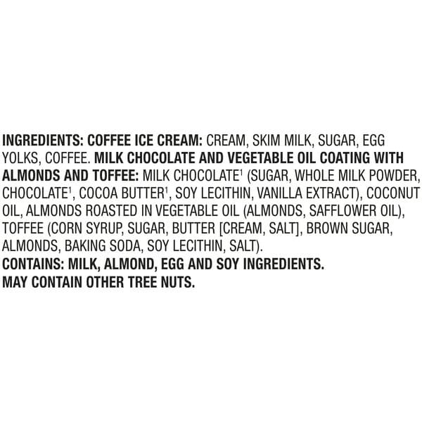 Coffee Ice Cream: Cream, Skim Milk, Sugar, Egg Yolks, Coffee. Milk Chocolate And Vegetable Oil Coating With Almonds And Toffee: Milk Chocolate¹ (sugar, Whole Milk Powder, Chocolate¹, Cocoa Butter¹, Soy Lecithin, Vanilla Extract), Coconut Oil, Almonds Roasted In Vegetable Oil (almonds, Safflower Oil), Toffee (corn Syrup, Sugar, Butter [cream, Salt], Brown Sugar, Almonds, Baking Soda, Soy Lecithin, Salt).
