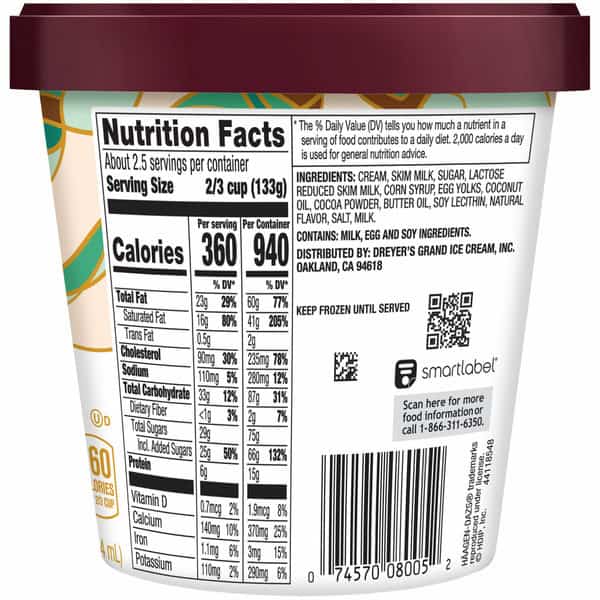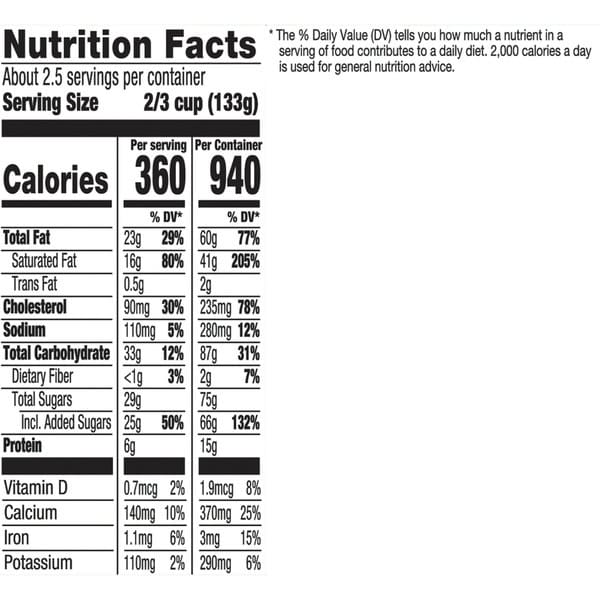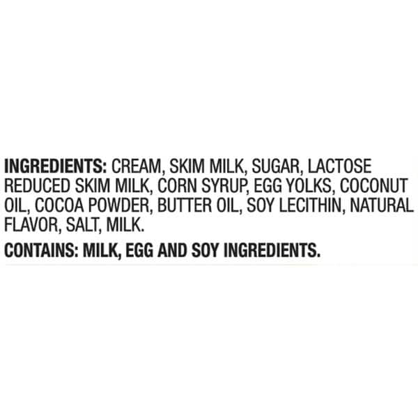 Cream, Skim Milk, Sugar, Lactose Reduced Skim Milk, Corn Syrup, Egg Yolks, Coconut Oil, Cocoa Powder, Butter Oil, Soy Lecithin, Natural Flavor, Salt, Milk.