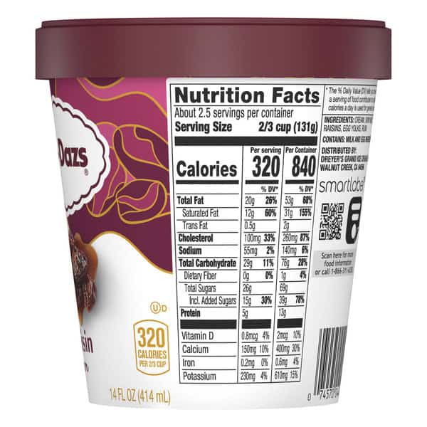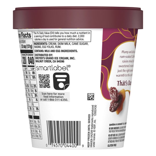 Häagen-Dazs Rum Raisin Ice Cream is crafted with sun-ripened California raisins that have been steeped in rum for 42 days before being blended into sweetened cream, for a warm and rich flavor experience. Plump and delicious rum-soaked California raisins mixed into sweetened cream adds just the right amount of warmth to this cool treat. With the finest of ingredients, including: cream, skim milk, cane sugar, egg yolks, and raisins, the Häagen-Dazs brand is dedicated to making the best tasting ice cream possible. We pride ourselves in using only the finest ingredients to make every bite of our ice cream one you’ll love. In 1960, two Polish immigrants from the Bronx decided to create a new luxury in ice cream. They invented a recipe, dreamed up a name, and made it happen. Today, we still stand for that kind of creativity and imagination and continue to transform the finest ingredients into the most luxurious ice cream to be enjoyed by all. Because we believe that luxury is found wherever you are – in moments large and small. Here’s to choosing deliciousness every single time. Häagen-Dazs believes that the highest quality ingredients make the best-tasting ice cream. With that in mind, Häagen-Dazs ice cream is OU Kosher dairy certified and is made with milk and cream from cows not treated with the growth hormone rBST*.