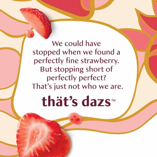 Häagen-Dazs Strawberry Ice Cream introduces sweet summer strawberries into milk and cream. Brimming with real fruit, the true flavor of our strawberries comes shining through. Thät’s dazsâ„¢.