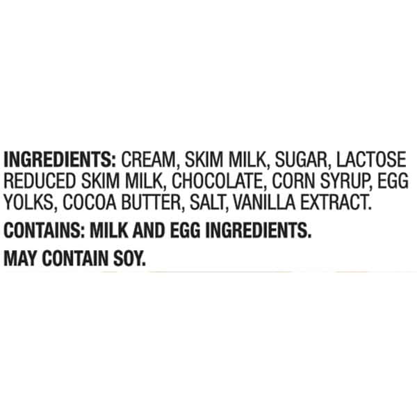 Cream, Skim Milk, Sugar, Lactose Reduced Skim Milk, Chocolate, Corn Syrup, Egg Yolks, Cocoa Butter, Salt, Vanilla Extract.