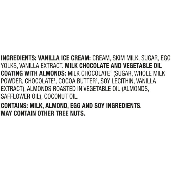 Vanilla Ice Cream: Cream, Skim Milk, Sugar, Egg Yolks, Vanilla Extract. Milk Chocolate And Vegetable Oil Coating With Almonds: Milk Chocolate1 (sugar, Whole Milk Powder, Chocolate1, Cocoa Butter1, Soy Lecithin, Vanilla Extract), Almonds Roasted In Vegetable Oil (almonds, Safflower Oil), Coconut Oil.