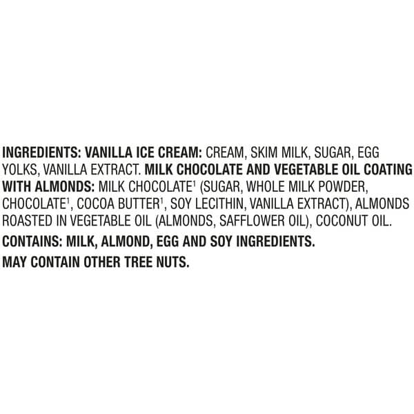 Vanilla Ice Cream: Cream, Skim Milk, Sugar, Egg Yolks, Vanilla Extract. Milk Chocolate And Vegetable Oil Coating With Almonds: Milk Chocolate1 (sugar, Whole Milk Powder, Chocolate’, Cocoa Butter1, Soy Lecithin, Vanilla Extract), Almonds Roasted In Vegetable Oil (almonds, Safflower Oil), Coconut Oil.