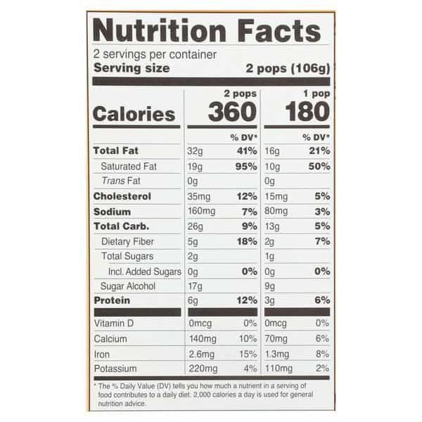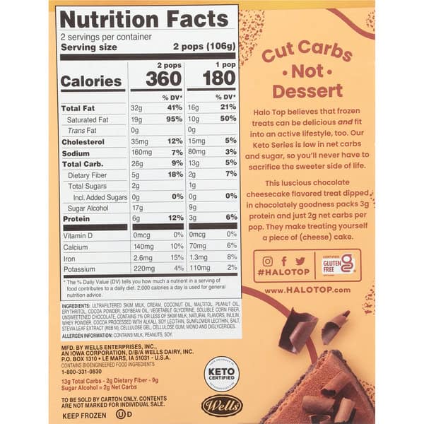 Halo Top Keto Chocolate Cheesecake Frozen Dessert Pops fit right into your lifestyle without sacrificing on the rich and decadent ice cream taste you’ve come to know and love from Halo Top. Packed with chocolate cheesecake flavor along with delicious fudge swirls throughout, this keto dessert is made to satisfy your tastebuds. These frozen desserts are the perfect way to treat yourself with only 2 grams net carbs and 3 grams of protein per dessert pop. Perfect as a quick keto friendly snack on your way out the door or as a tasty reward for completing your exercise goals, these chocolate cheesecake frozen dessert pops are a convenient way to love yourself more while you prioritize your wellbeing. These keto sweet treats are also a great choice for special occasions, at-home date nights or relaxing self care evenings. Halo Top Chocolate Cheesecake Frozen Dessert Pops come in a box that can be resealed for easy storage in your freezer until you’re ready to enjoy a keto friendly, high flavor sweet treat.