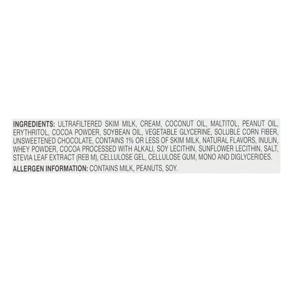 Ultrafiltered Skim Milk, Cream, Maltitol, Coconut Oil, Peanut Oil, Erythritol, Cocoa Powder, Eggs, Vegetable Glycerine, Unsweetened Chocolate, Soluble Corn Fiber, Skim Milk, Contains 1% Or Less Of Inulin, Natural Flavors, Cocoa Processed With Alkali, Sunflower Lecithin, Salt, Stevia Leaf Extract (rebm), Soy Lecithin, Soybean Oil, Cellulose Gel, Cellulose Gum.