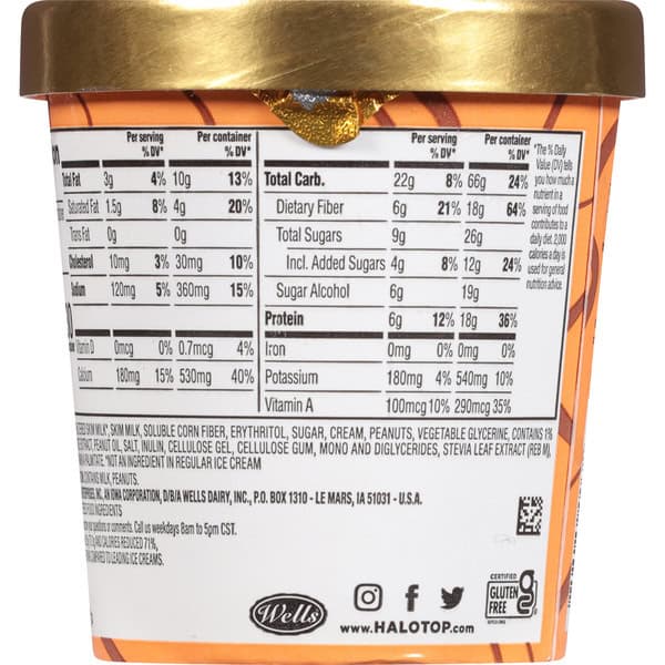 Halo Top Peanut Butter Cup Light Ice Cream delivers peanut butter and chocolate deliciousness that you can enjoy while you pursue your path to wellness. This delicious flavor features chocolate peanut butter light ice cream with a peanut butter swirl for a better-for-you light ice cream treat. Ultrafiltered skim milk and other high-quality ingredients come together to create a creamy, light ice cream that actually tastes like ice cream. While you prioritize your wellness, love yourself more with this protein-packed light ice cream pint that contains 71% fewer calories and 88% less fat per serving compared to leading ice creams. A delicious Kosher and gluten free snack, this frozen dessert is a great choice for special occasions, at-home date nights or relaxing self care evenings. You can also use this peanut butter cup light ice cream to make frozen ice cream treats, like ice cream sandwiches or ice cream sundaes, for a sweet treat after long days. Halo Top light ice cream comes in an easy to store, resealable package, so you can keep it until you’re ready to enjoy a classic frozen treat with a modern twist.