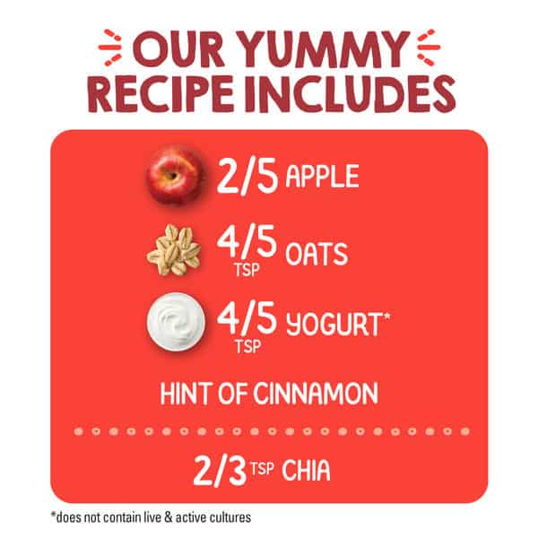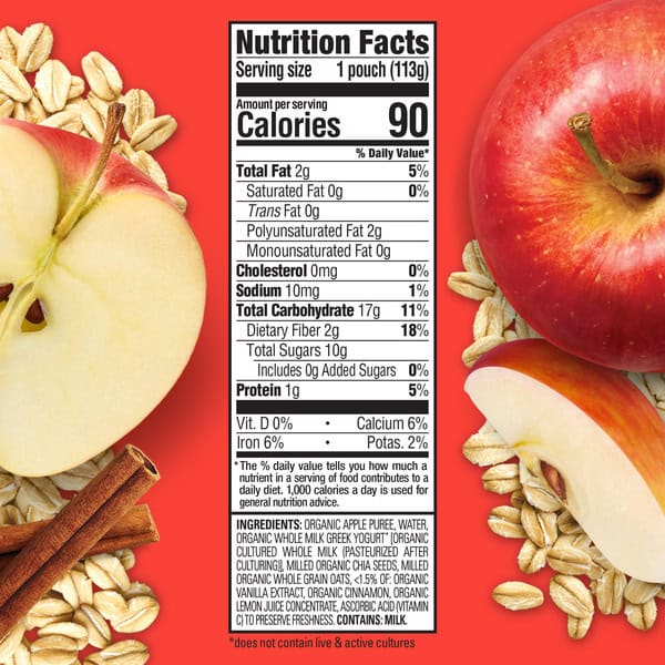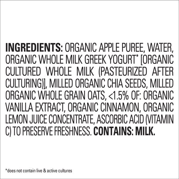 Organic Apple Puree, Water, Organic Whole Milk Greek Yogurt [organic Cultured Whole Milk (pasteurized After Culturing)], Milled Organic Chia Seeds, Milled Organic Whole Grain Oats, <1.5% Of: Organic Vanilla Extract, Organic Cinnamon, Organic Lemon Juice Concentrate, Vitamin C (ascorbic Acid) To Preserve Freshness