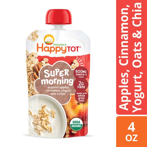 Turn a good morning into a super morning, with Happy Tot Super Morning organic toddler pouches. Each pouch features a delicious breakfast blend, like organic apple, cinnamon, and whole milk yogurt*. These recipes also include whole grain oats and chia for added nutrients like omega-3s and fiber in your tot’s diet – a convenient and satisfying start to the day for your growing little one.