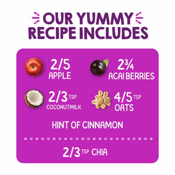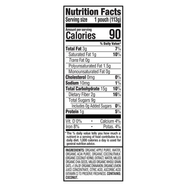 Organic Apple Puree, Water, Organic Acai Puree, Organic Coconut Milk (organic Coconut Kernel Extract, Water), Milled Organic Chia Seeds, Milled Organic Whole Grain Oats, <1.5% Of: Organic Cinnamon, Organic Lemon Juice Concentrate, Citric Acid, Vitamin C (ascorbic Acid) To Preserve Freshness
