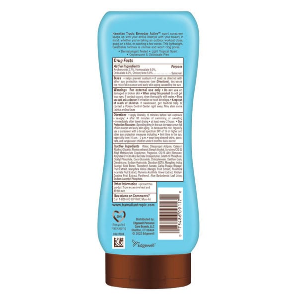 Hawaiian Tropic Everyday Active Sunscreen Lotion SPF 50 is an ultra-light, high-performance sport sunscreen that keeps up with your active lifestyle. Whether you’re taking your favorite outdoor workout class, hiking with your dog, or catching a few waves, this breathable SPF is oil-free and won’t clog pores, so you can easily apply and re-apply throughout the day. This sunscreen is water and sweat resistant, and it won’t sting your eyes. Hawaiian Tropic Everyday Active Sunscreen Lotion is dermatologist tested and made with island-inspired botanicals like papaya, mango and plumeria. Hawaiian Tropic SPF provides broad spectrum UVA/UVB protection and is free from oxybenzone for skin-loving suncare you can trust.